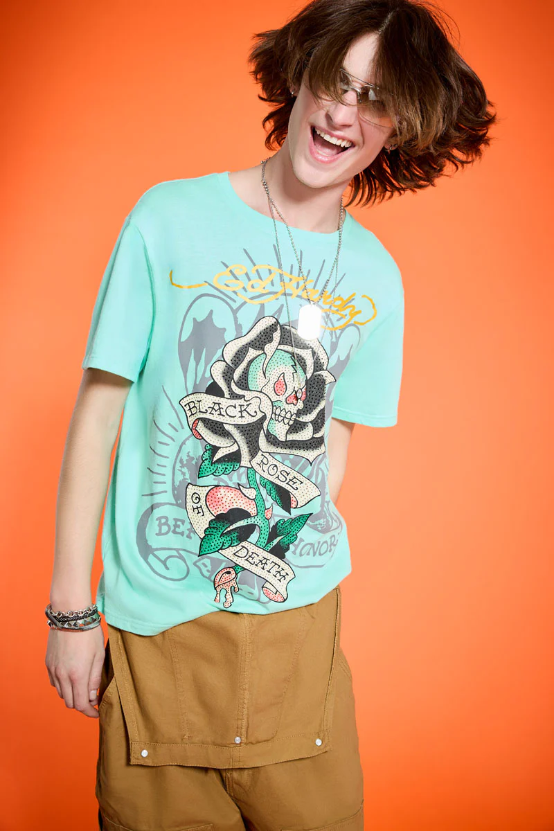 This rhinestone adorned t-shirt is cut in a regular fit and constructed from a soft cotton blend. Complete with a Panther Head graphic and two archival Ed Hardy logos.