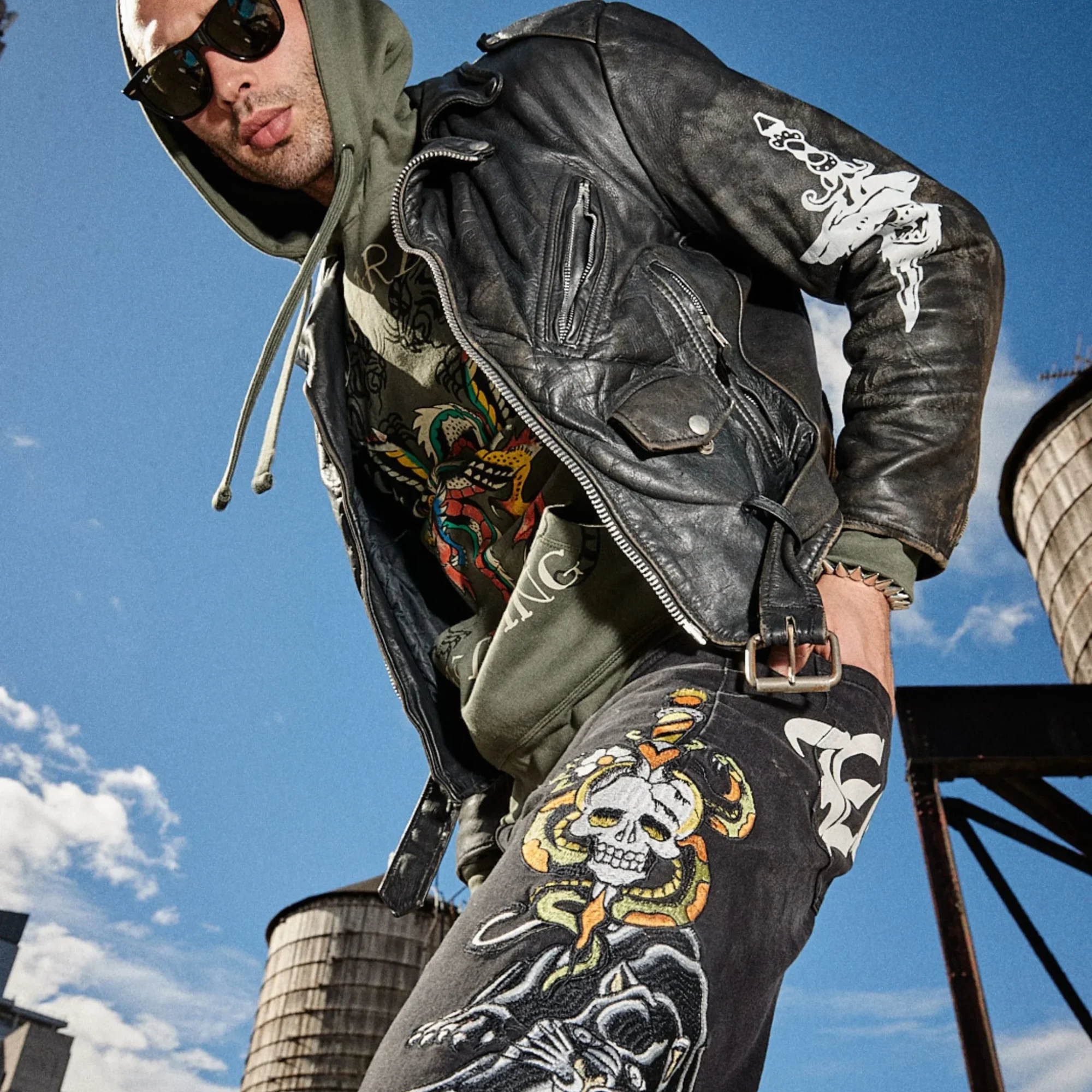 Embrace Y2K fashion nostalgia with Ed Hardy Denim. These black jeans feature a slim tapered silhouette, classic cotton fabrication, and a dagger skull graphic.